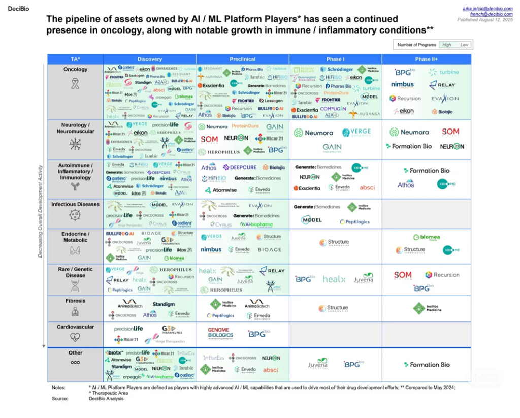 This report organizes the projects of AI-driven pharma companies by therapeutic area (like oncology or immunology) and R&D stage (from early discovery to clinical phase II). Most companies are still stuck in the lab (discovery or preclinical), and very few projects have reached human clinical trials. Whether AI’s promise will be fulfilled depends on who can successfully cross this critical clinical boundary.