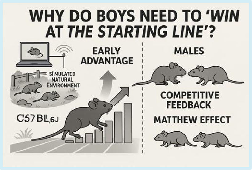 A recent study published in Science uncovers the crucial role of early advantage in male success, using male mice as a model. The findings reveal that competition among male mice for territory and resources begins early. Those that secure territorial advantages in their youth enjoy accelerating benefits over time, leading to a self-reinforcing cycle of success.